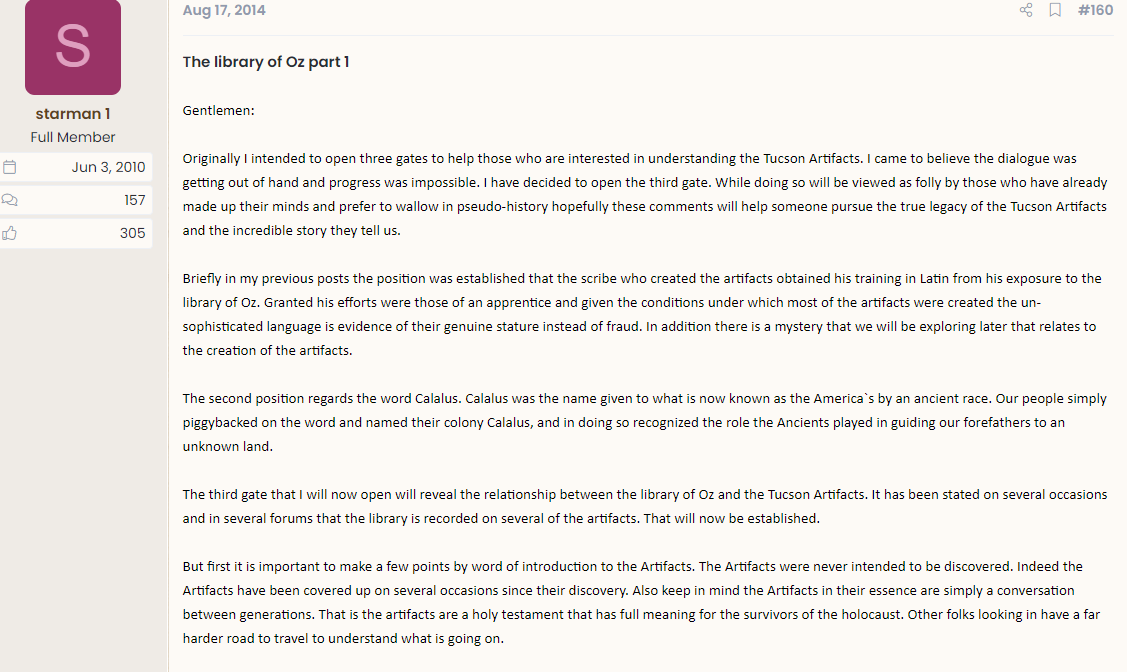 When we posted the relationship between the Tucson Artifacts and the library of Oz and the reference on the artifacts to that library I thought we had perhaps said too much not to little. It is one thing to prove something it is another thing to figure it out. That is where your work must be done.