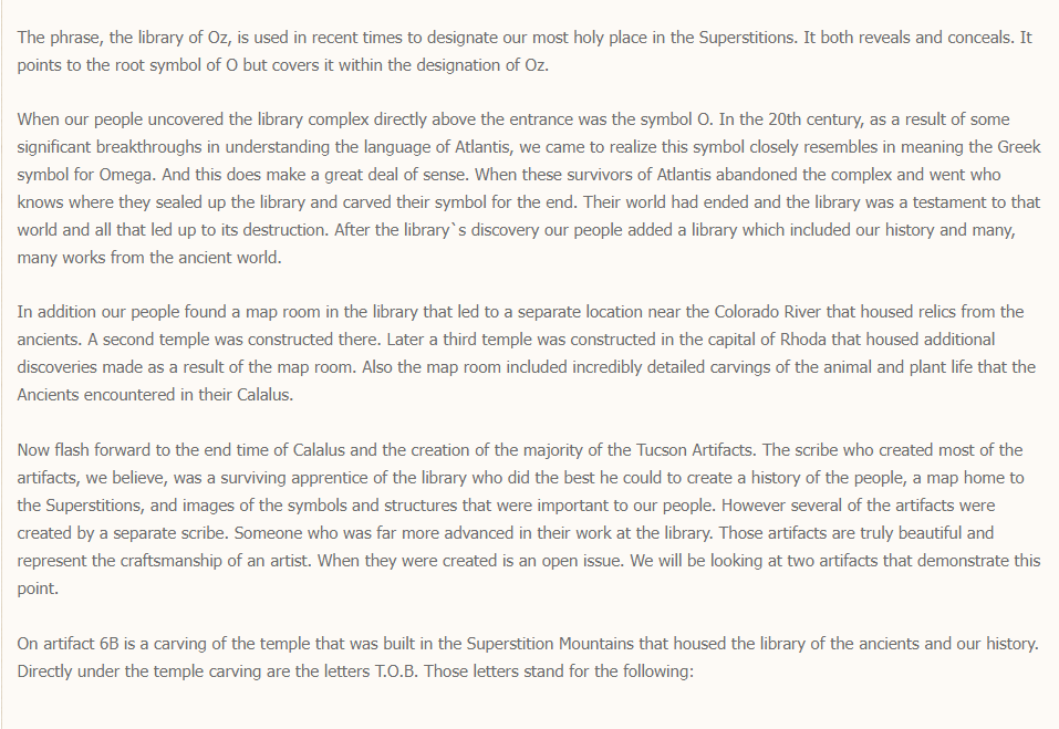 “On artifact 6b is a carving of the Temple that was built in the Superstition Mountains that housed the library of the ancients and our history.”