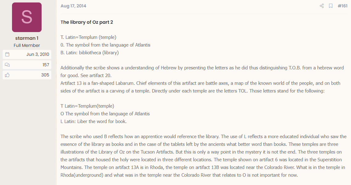 “Furthermore has anyone ever noted the connection between the Tucson Artifacts and Oz? On the Tucson artifacts there exists the Letter OL that repeat continually. Some have taken it to mean the author of the artifacts.